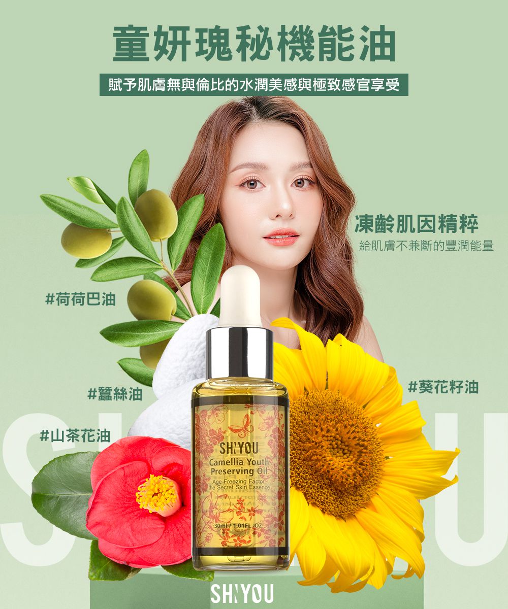 童妍瑰秘機能油能提升肌膚自我修復功能,專為熟齡肌膚研發設計,搭配維他命A酯、山茶花油、米糠油、維他命E等高效機能成分,能同時兼顧完美肌膚的所有需求:除皺、緊實、保濕、潤澤。當機能油接觸肌膚時,微滴粒子將細膩地與肌膚完美融合,釋放最新鮮的山茶花精萃,帶給肌膚不間斷的豐潤能量,發揮最佳護膚成效。童妍瑰秘機能油前所未有的水感質地,賦予肌膚無與倫比的水潤美感與極致感官享受。在接觸的瞬間便能感到它細膩絲滑的質感。